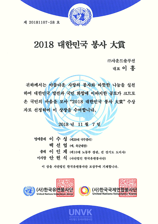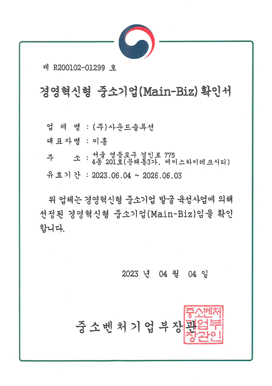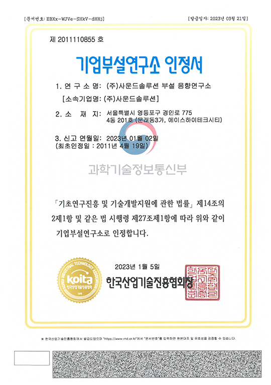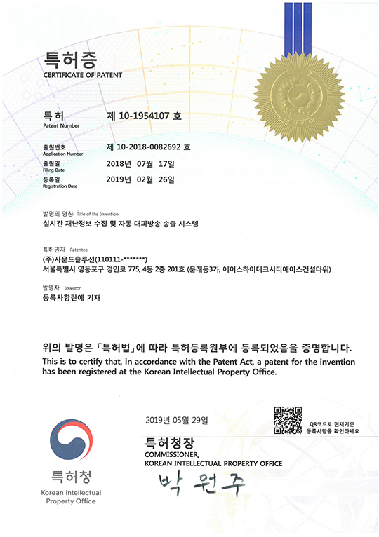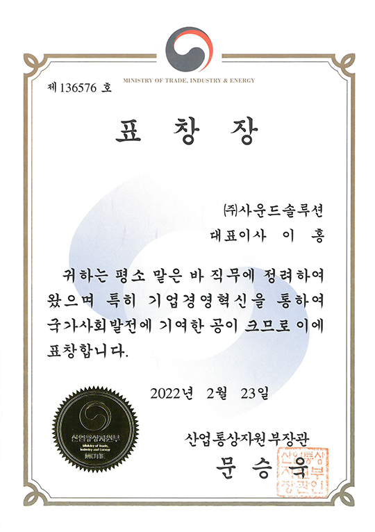 특허권 2018 대한민국 봉사대상 산업통산자원부장관 표창 엔지니어링사업자등록증 한국제품안전협회 회원증 경영혁신 중소기업 확인서 기업부설연구소 인정서 직접생산확인증명서 공장등록증명서 소프트웨어사업자신고확인서 사운드솔루션 정보통신공사업등록업 등록증 정보통신공사업회원증